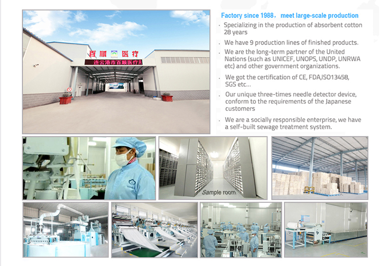 BAI SHUN medical is a professional supplier of medical product development, covering thousand of products in the medical field. We have our own factory which established in 1988 which specialized in the production of medical absorbent cotton series product,gauze product, non woven products, all kinds of plasters, bandages, tapes and the other medical products. And we are also developing more rapid test,blood pressure monitor,blood glucose,Injection Syring,wheelchair,walker,and so on.